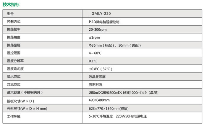 ●立式双层摇板设计,节省占地空间;设定温度、转数.时间、和实测温度、转数、剩余时间在同一界面显示,LCD大屏幕背光液晶显示按键式仪表,参数设定、观察清断直观。